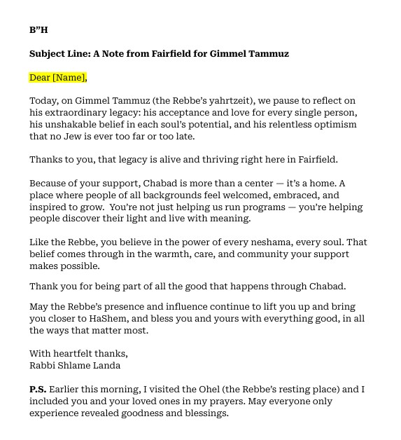 Rothman Coaching provides a collection of samples and resources designed to help Moisads strengthen donor relationships and improve fundraising communication. These materials include structured templates, storytelling examples, and communication tools that guide Shluchim in appreciating donors, sharing impact, and maintaining consistent engagement. The resources focus on practical donor stewardship strategies that makes fundraising more relational, meaningful, and sustainable.
